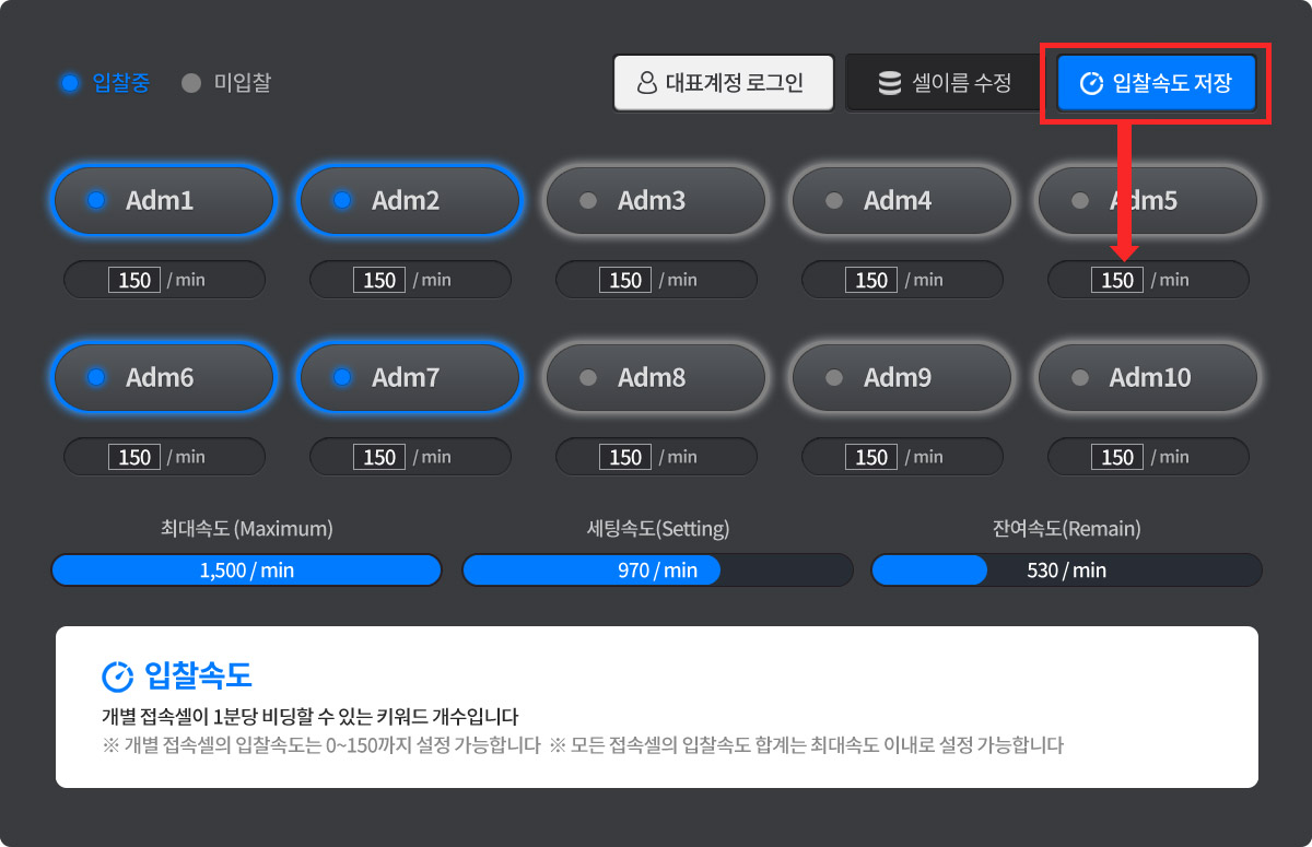 ※ 입찰속도란? 다비드 시스템이 1분당 순위조회와 비딩을 진행하는 키워드의 개수 입니다.