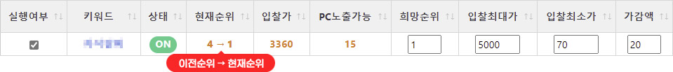 검색광고시스템에서의 현재 키워드 상태가 출력됩니다 (ON / OFF) |
