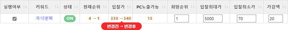 해당 키워드의 입찰금액 최대가를 설정할 수 있습니다