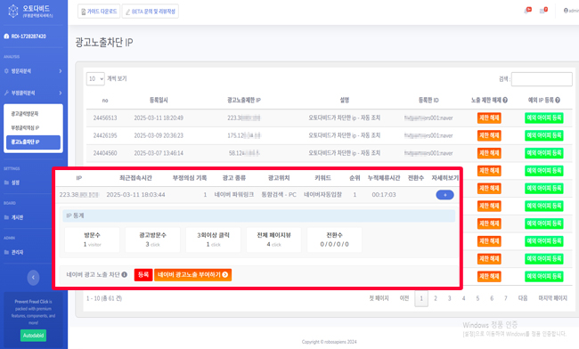 해당 IP에 광고노출 차단 및 환급신청을 진행하실 수 있습니다.