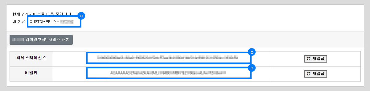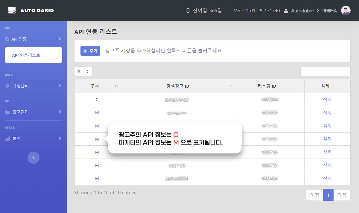 검색광고시스템에서의 현재 키워드 상태가 출력됩니다 (ON / OFF) |