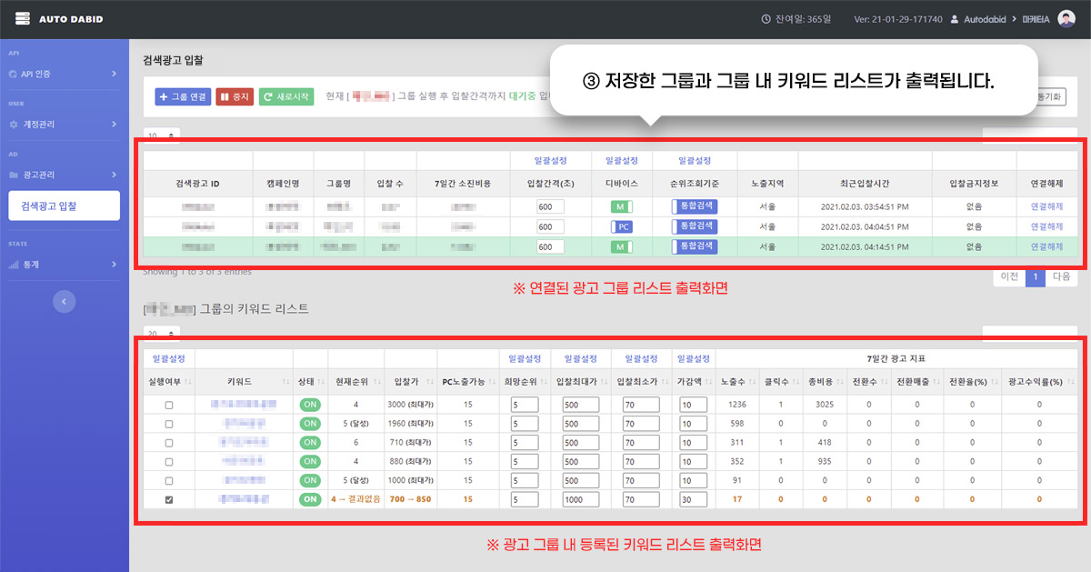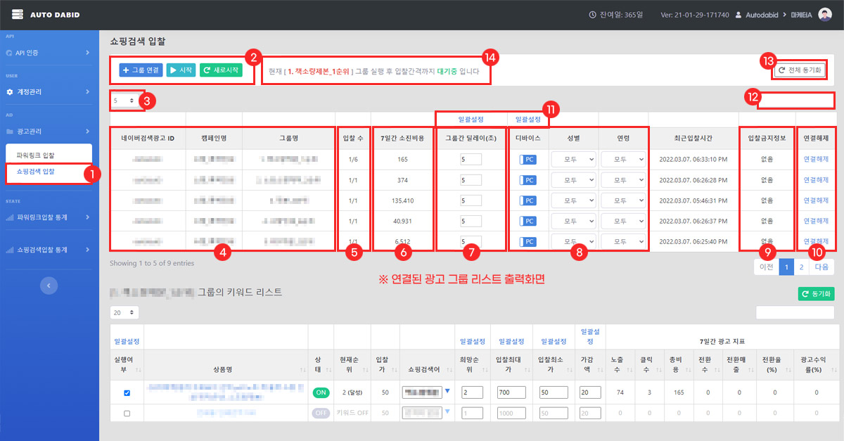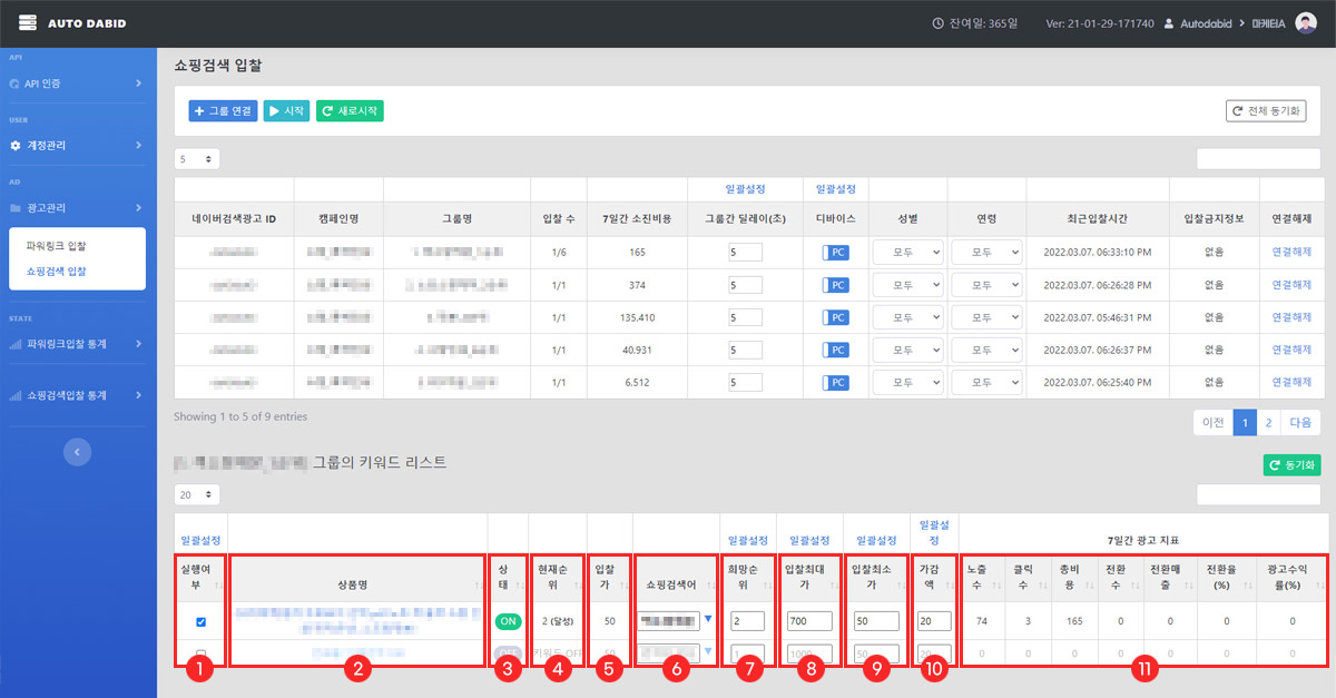 그룹에 등록된 키워드 중 자동입찰이 진행되는 키워드 수가 출력됩니다. (자동입찰실행수 / 전체 키워드수) |