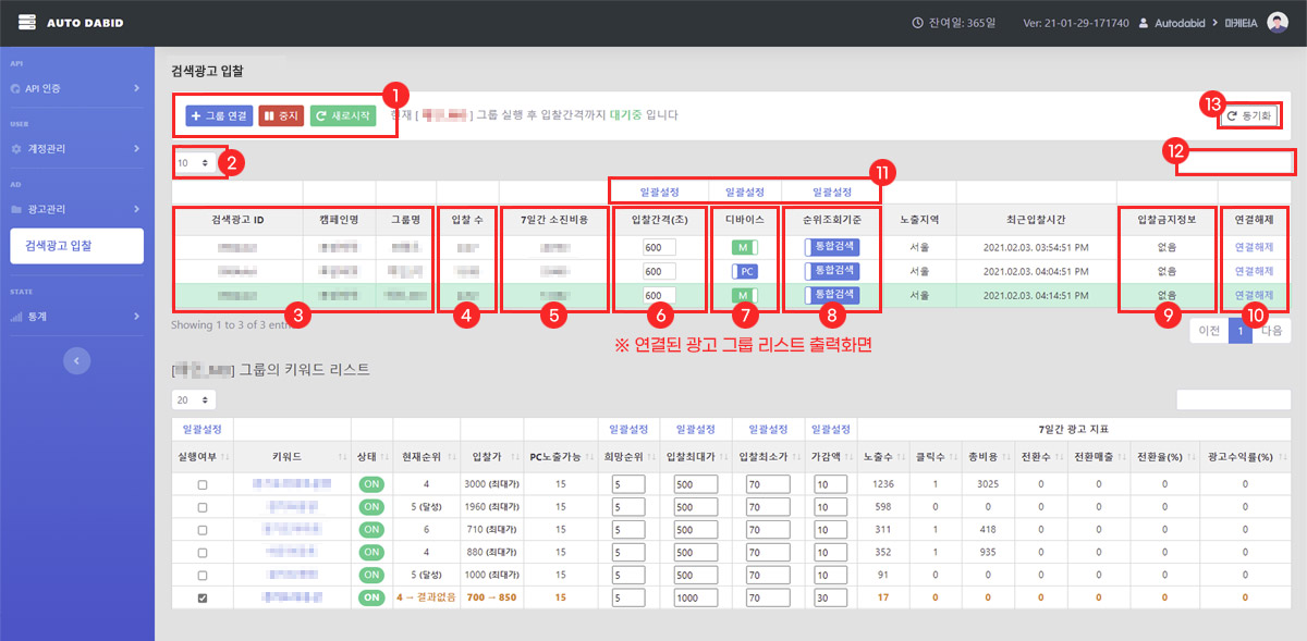 검색광고시스템에서 변경된 설정 값이 있을 경우 오토다비드 DB에 수동으로 동기화하는 기능입니다 |