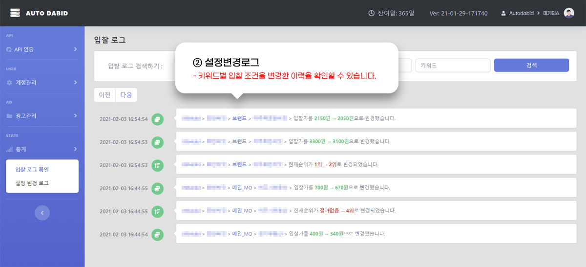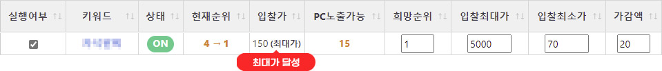 해당 키워드의 입찰금액 최대가를 설정할 수 있습니다