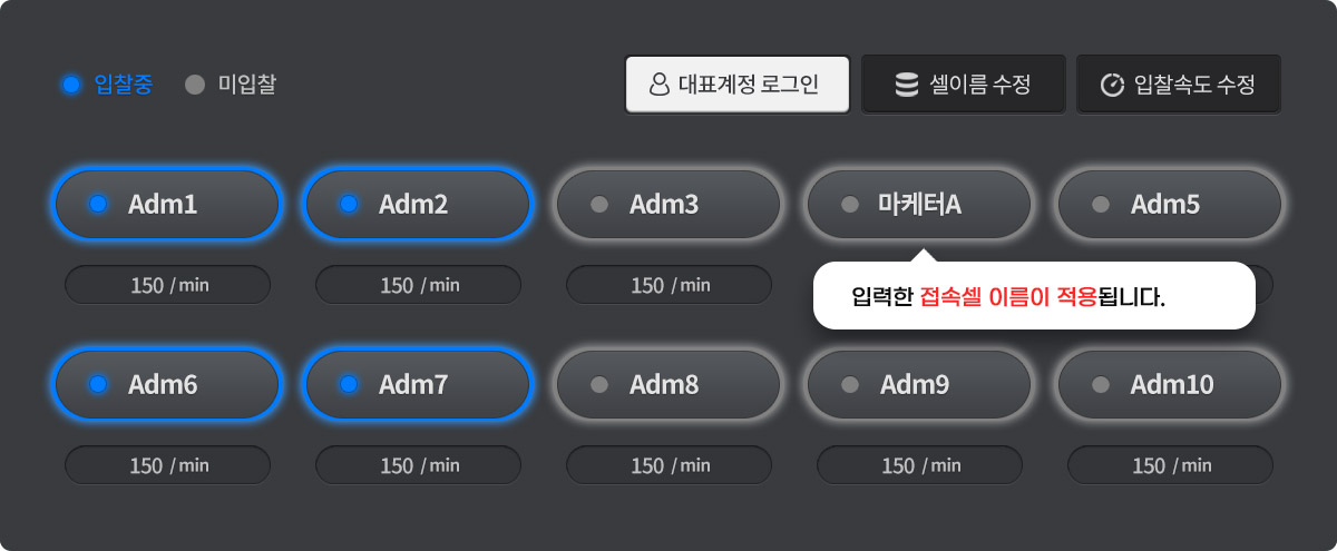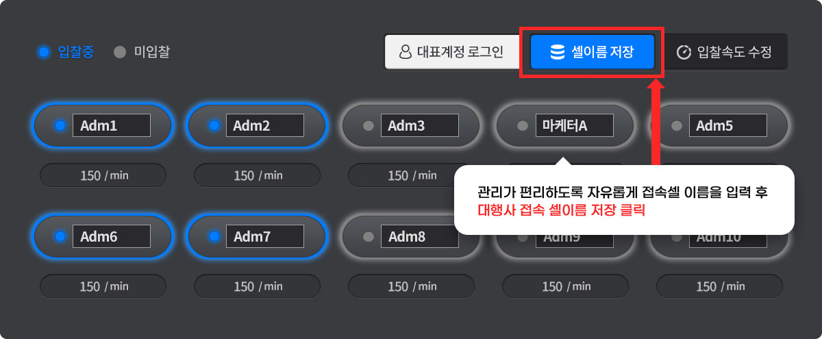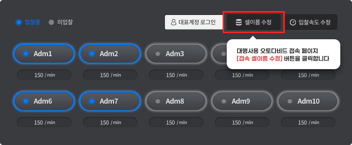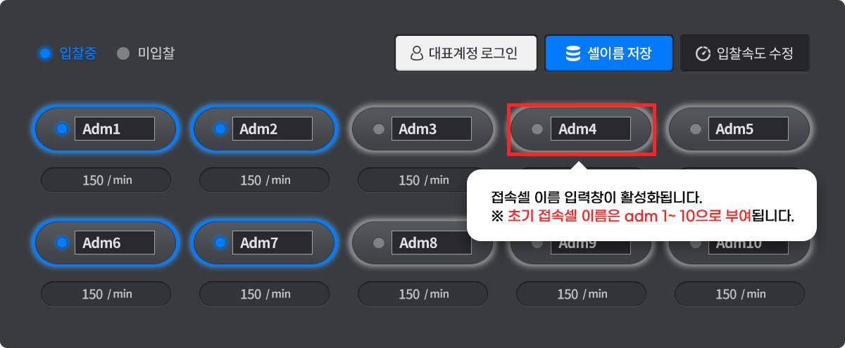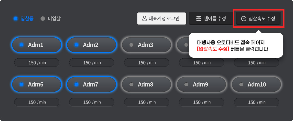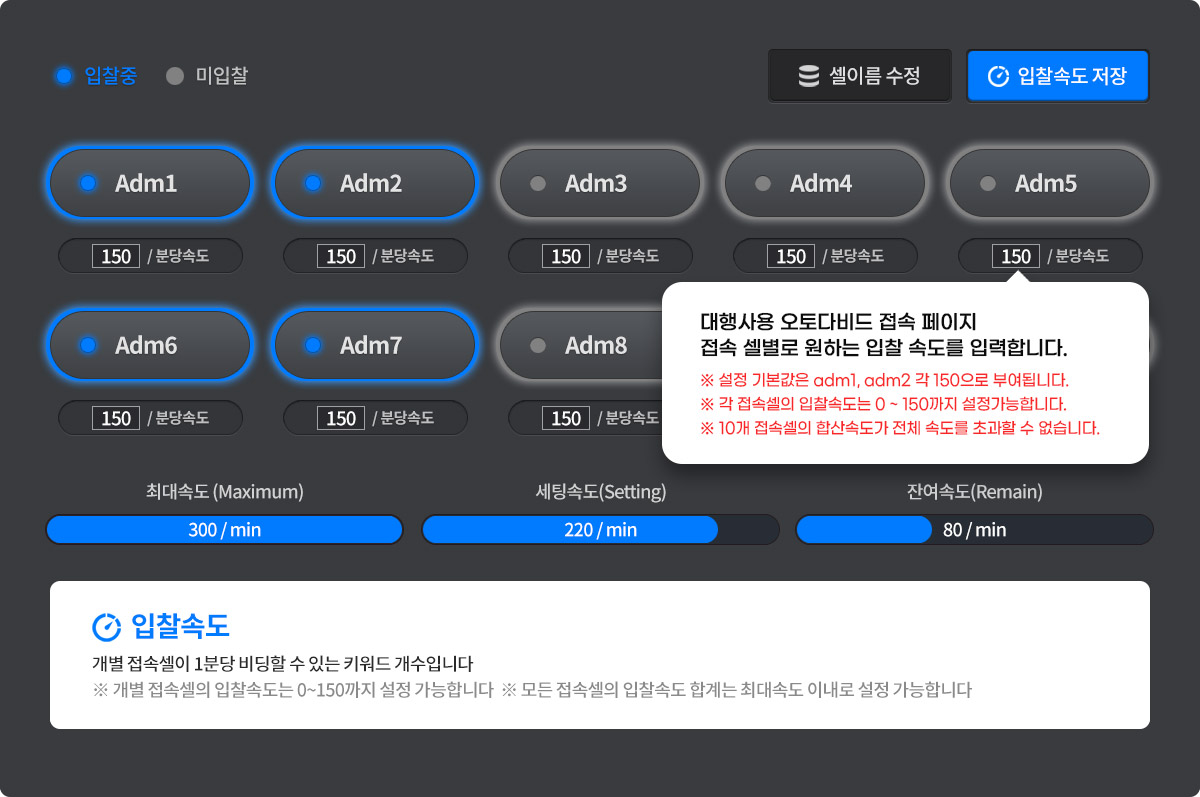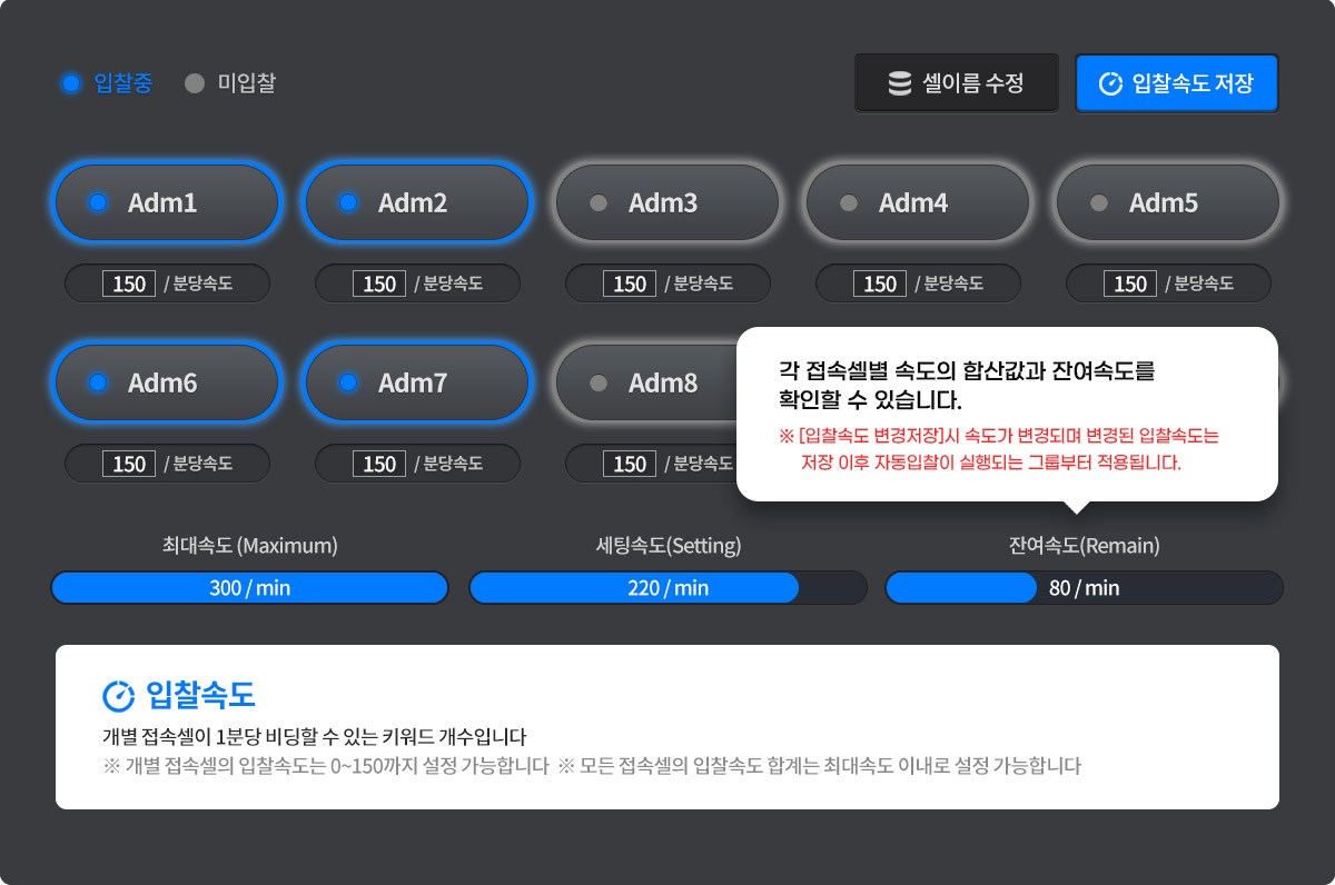 - 각 접속 셀별로 원하는 입찰 속도를 조절 할 수 있습니다.