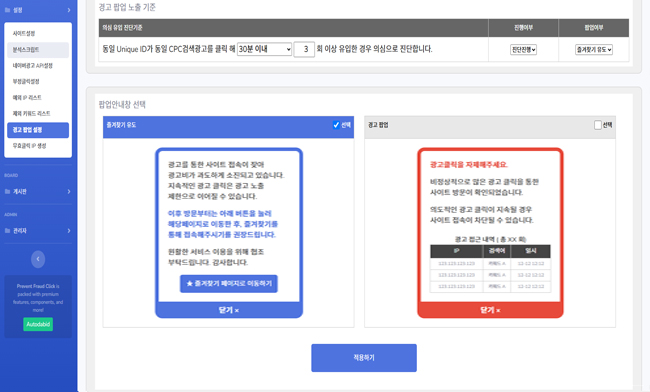 의심 클릭 접속자에 대한 경고창 노출을 설정합니다. 즐겨찾기 유도 메시지 또는 법적대응 경고 메시지를 선택할 수 있습니다.